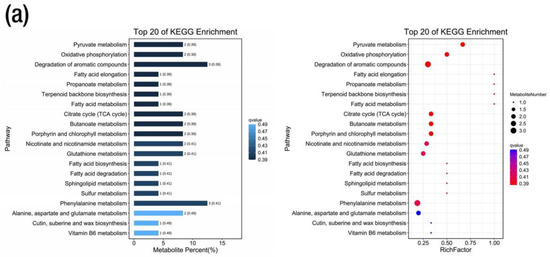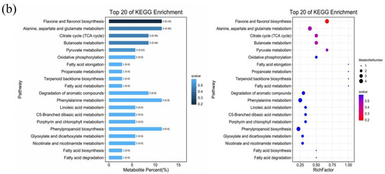 Differential metabolite KEGG enrichment analysis of the top 20 pathways from Mg treatments in mulberry. (a) Mg deficiency (CK-T1); (b) Mg toxicity (CK-T5). The bar graph represents the metabolites’ percentages in the pathways, and the bubble plot on the right side represents the enrichment factors of the metabolites in the pathways using the smallest q-values.