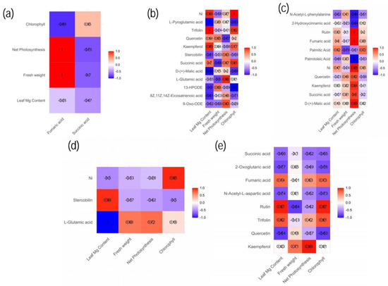 A correlation map analysis was conducted to visualize the correlations between the DEMs in the significant KEGG pathways and the physiological data in each group comparison. The correlation map (Figure 10) indicated a strong correlation between physiological parameters and some of the DEMs in the KEGG pathways. Organic acids such as fumaric acid correlated positively and strongly (r = 1) with fresh weight and Pn, while succinic acid correlated positively with chlorophyll in the Mg deficiency group (Figure 10a). Moreover, there was a negative correlation between chlorophyll and leaf Mg content, particularly with a strong negative correlation between chlorophyll and fumaric acid (r = −0.89), and same was seen with succinic acid.