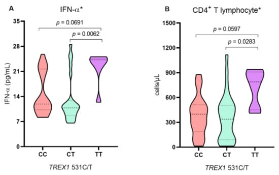 The levels of CD4+ T lymphocytes, IFN-α, viral load and positivity for ANA were evaluated in relation to the genotypes for the TREX1 531C/T polymorphism and demonstrated that the levels of CD4+ T lymphocytes and IFN-α were higher in individuals with the TT polymorphic genotype (p < 0.05; Figure 1A,B), but no significant difference was observed in viral load levels (log 10) (Figure 1C) or ANA frequency (Figure 1D) between the different genotypes for the TREX1 531C/T polymorphism.