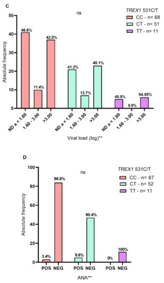 Comparison of levels of (A) IFN-α, (B) CD4+ T lymphocytes, (C) viral load and (D) ANA frequency according to genotypes for the TREX1 531C/T polymorphism. * Kruskal–Wallis test; ** G test, ns: not significant.