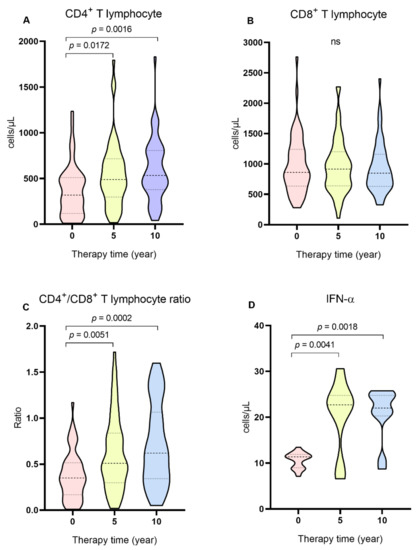 Comparison of the levels of (A) CD4+ T lymphocytes, (B) CD8+ T lymphocytes, (C) CD4+/CD8+ ratio and (D) IFN-α between groups naïve to ART, with 5 and 10 years of therapy. Kruskal–Wallis test, ns: not significant.
