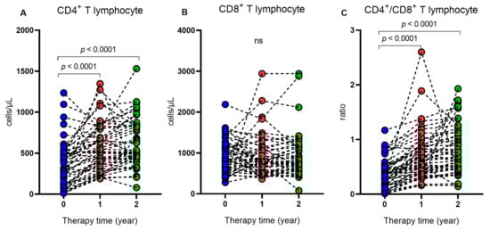 Comparison of the levels of (A) CD4+ T lymphocytes, (B) CD8+ lymphocytes and (C) CD4+/CD8+ ratio of individuals with HIV-1 in the period without ART and after one and two years of therapy, ns: not significant.