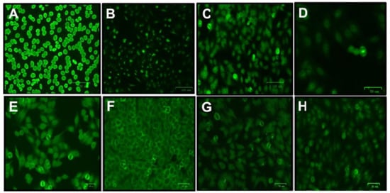 Immunofluorescence patterns of antinuclear antibodies in HEp-2 ANA+ cells from individuals with HIV-1 at different times of treatment. (A) homogeneous nuclear; (B) fine dotted nucleolar; (C) fine dotted nuclear; (D) Numa (mitotic apparatus); (E) cytoplasmic; (F) fine dotted cytoplasmic; (G) thick dotted nuclear; (H) nucleolar with isolated dots. Image resolution 100 µm (A–C), 50 µm (D–H).