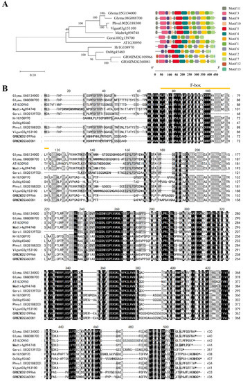 Phylogenetic tree and multiple sequence alignment of UFO genes. (A) Phylogenetic analysis of the selected 11 UFO proteins from nine species, namely Arabidopsis thaliana (AT1G30950), Glycine max (Glyma.05G134000, Glyma.08G088700), Medicago truncatula (Medtr4g094748), Vigna unguiculate (Vigun03g153100), Phaseolus vulgaris (Phvul.002G188300), Gossypium raimondii (Gorai.002G139700), Oryza sativa (Os06g45460), Zea mays (GRMZM2G109966, GRMZM2G360081), and Hordeum vulgare (Hr1G108970). The neighbor-joining tree was constructed using MEGA11, and the bootstrap value was set at 1000 replicates. (B) Amino acid sequence alignment of UFOs in soybean and other species. The orange line represents the F-box domain; the black shade represents the conserved amino acids, and the gray shade represents the relatively conserved amino acids.