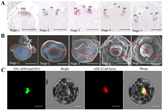 The expression profile of GmUFO1. (A) In situ hybridization of the GmUFO1 gene in the soybean flower primordium of different development stages, and the signals were purple. Bar = 100 μm. (B) Scanning electron microscopy (SEM) observations of in situ hybridization and stereoscopic models of GmUFO1 gene expression at five developmental stages. The areas of gene expression were shown in blue and the red lines represented the slice position corresponding to (A). Bar = 100 μm. (C) Expression location of GmUFO1-GFP in Arabidopsis thaliana. The GFP signals were green and mCherry signals were red. Bar = 10 μm.