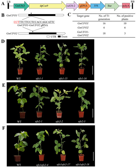 To obtain the GmUFO mutants, the CRISPR/Cas9-mediated genome editing of the GmUFO genes was performed, and the target site for both GmUFO1 and GmUFO2 was located ahead of the F-box domain (Figure 3A,B). Four independent T0 generation transgenic lines were obtained, and subsequently, 40 T1 generation transgenic lines were generated from the four T0 plants (Table S4). In the T1 generation, GmUFOs were sequenced, and, based on the target sites sequencing data, ten Gmufo1 single mutants, six Gmufo2 single mutants, and three Gmufo1ufo2 double mutants were identified (Figure 3C and Figure S2, Table S4). These mutants were used for further investigation in this study.