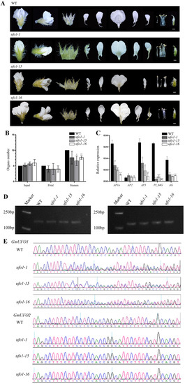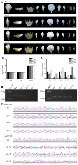 Furthermore, five ABC function genes, namely GmAP1a, GmAP2, GmAP3, GmPI04G, and GmAG were selected, and their expression was detected using qPCR in the three Gmufo1 lines and the wild type. The expression levels of GmAP1a, GmAP3, GmPI04G, and GmAG decreased in all three lines, while the expression levels of GmAP2 increased (Figure 4C). The expression of GmUFO1 and GmUFO2 gene transcripts in Gmufo1 were detected, and it was found that they did not differ from the wild type (Figure 4D).