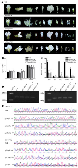 Among the T1 knockout lines, three lines from different T0 generation lines were double mutated and selected for further analysis. In the case of the GmUFO1 gene, line Gmufo1ufo2-4 had a 4-bp deletion at the target site, Gmufo1ufo2-17 had a 1-bp deletion at the target site, and Gmufo1ufo2-18 showed a 1-bp deletion after the target site. However, in the case of the GmUFO2 gene, all three selected mutant plants were heterozygotes at the target site (Figure 6). The vegetative appearance showed no obvious difference in the seedlings of double mutants compared with the wild type (Figure 3F), whereas there were more mosaic organs formed with sepal-like petals and petal-like stamens, and the alteration in the organ number and shape of the double mutant was relative to the Gmufo1 single mutant (Figure 6A, Table S5).