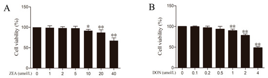 Effects of ZEA and DON on BRL 3A cells viability. CCK-8 was used to detect the effect of ZEA (A) and DON (B) on BRL 3A cells viability. Values are the mean ± SD of three individual experiments; * p < 0.05, ** p < 0.01 indicate significant differences between toxins treated groups and control groups.