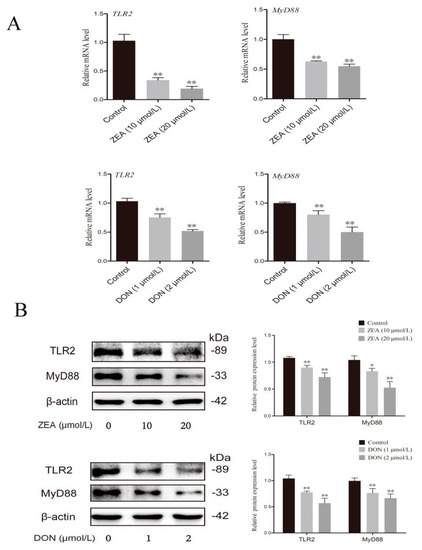 TLR2 is a receptor involved in the cellular recognition of Gram-positive bacteria. It transmits a signal downstream through the receptor adaptor protein myeloid differentiation factor (MyD88), causing the release of immune products. The effect of ZEA and DON on the expression of TLR2 and MyD88 in BRL 3A cells was measured (Figure 2), revealing that ZEA and DON both significantly inhibited both gene (Figure 2A) and protein (Figure 2B) expression of TLR2 and MyD88 (p < 0.05 or p < 0.01).