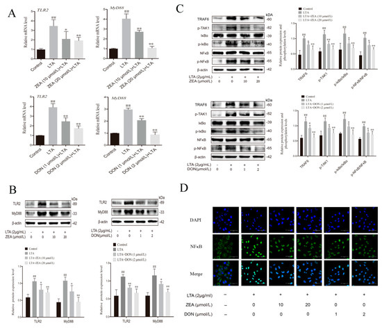 ZEA and DON inhibited the LTA-induced TLR2/NFκB signaling pathway in BRL 3A cells. (A,B) The gene and protein expression of TLR2 and MyD88 was detected via qPCR and Western blotting. (C) Protein expression and phosphitylation levels of TRAF6, p-TAK1, p-IκBα/IκBα, and p-NFκB/NFκB were analyzed via western blotting. Values are the mean ± SD of three individual experiments. ## p < 0.01, indicate significant differences between LTA groups and control groups; * p < 0.05 and ** p < 0.01, indicate significant differences between toxin treated groups and LTA groups (D) Fluorescence microscopy images indicate that NFκB nuclear translocation occurred. NFκB (green), DAPI (blue), scale bar = 50 µm.