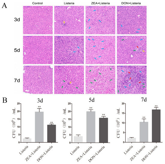 The bacterial load in the liver tissues of treated and untreated mice was detected (Figure 5B). On days three, five, and seven after bacterial infection, in comparison to the L. monocytogenes treatment group, the bacterial load in the liver tissues of the ZEA and DON treatment groups all increased significantly (p < 0.01). These results indicated that ZEA and DON increased the amount of L. monocytogenes in mouse livers and that the degree of bacterial infection aggravated liver damage.