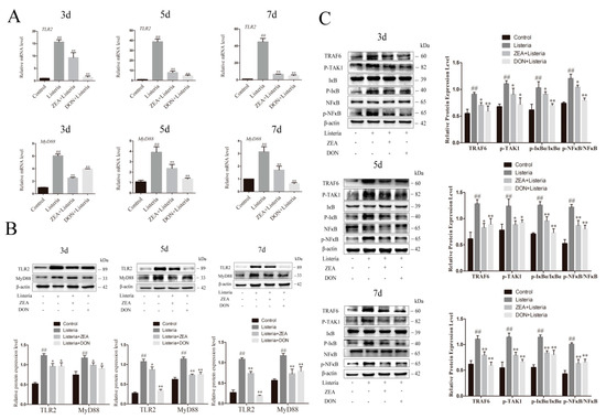 The innate immune responses of hepatocytes against L. monocytogenes infection can be exerted through the TLR2/NFκB pathway. The expression and phosphorylation levels of proteins associated with the TLR2/NFκB signaling pathway in the liver were detected at three, five, and seven days after infection with L. monocytogenes (Figure 7). Compared to the control group, the expression of TLR2, MyD88 mRNA, and protein was significantly increased in the L. monocytogenes group (p < 0.01). However, the protein and mRNA expression of TLR2 and MyD88 was significantly lower in the ZEA and DON groups than in the L. monocytogenes group (p < 0.05 or p < 0.01) (Figure 7A,B). Subsequent measurement of NFκB pathway-related proteins revealed that ZEA and DON treatment also inhibited the expression of TRAF6 and p-TAK1, as well as decreasing phosphorylation levels of IκB and NFκB after L. monocytogenes induction (p < 0.05 or p < 0.01) (Figure 7C). This was consistent with cell measurements.