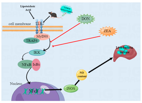 After L. monocytogenes infects the liver, inducing cell innate immunity provides an immediate response, which is nonspecific and generalized to injury or infection. The response is mediated by germline-encoded pattern recognition receptors, such as Toll-like receptors (TLRs) [19]. TLR2 is a key innate immune receptor. David et al. [20] observed that TLR2-deficient mice were more susceptible to systemic infection with L. monocytogenes than wild-type mice, causing reduced survival rates and an increased bacterial load in the liver [19,20]. When the body is infected with pathogenic microorganisms, such as Gram-positive pathogens, hepatocytes can produce NO through the TLR2/NFκB pathway as a part of innate immunity [21]. Zhao et al. showed that a selenium (Se) deficiency led to inflammation by activating the NF-κB pathway through multiple mechanisms in the livers of pigs, causing immune responses [22]. The TLR2/NFκB signaling pathway’s role in the innate immune response to bacterial infection in conjunction with mycotoxins in the liver is currently unclear.