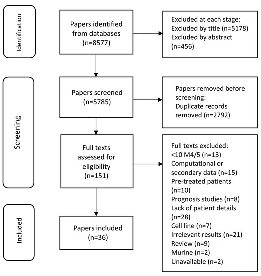 The search strategy used identified a total number of 8577 articles (Supplementary Table S2). Of these, 5785 remained after the removal of duplicates. Articles were discarded in stages according to the exclusion criteria as shown in the Preferred Reporting Items for Systematic Reviews and Meta-Analyses (Prisma-P) flow diagram (Figure 1). A total of 36 articles remained at the end of the process, which were then subjected to QUADAS-2 assessment to check for risk of bias [20]. The QUADAS-2 scores (Supplementary Table S3) were then applied to each of the 71 potential targets (Table 3) which led to the elimination of eight targets from the final list of potentially viable targets for immunotherapy.