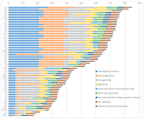 Prioritisation of the 63 potential treatment targets identified in AML by systematic review and found in articles that remained after quality control. Prioritisation was performed using the National Cancer Institute Pilot Project as a model [10], based on nine predefined, pre-weighted criteria. The antigens were scored to determine their suitability for further investigation as therapeutically effective cancer vaccines.