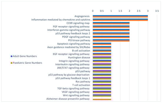 To determine which pathways were predominantly affected within adult and paediatric AML cells, the NCBI numbers of the top 20 targets, as identified by the modified Cheever model (in Section 3.3), were independently entered into Protein Analysis Through Evolutionary Relationships (PANTHER) [59]. PANTHER contains 176 different pathways within its database, of which 25 pathways were found to include the AML antigens identified in this study. There were notable similarities in the pathways involved as well as their relative involvement in AML between adult and paediatric patients (Figure 4). Only one pathway, the Alzheimer’s disease presenilin pathway, differed between the two age groups of AML patients, as it was only present within the top 20 for paediatric AML. The two pathways with the highest number of targets involved in both adult and paediatric AML age groups were angiogenesis and inflammation mediated by the chemokine and cytokine signalling pathway.