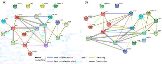 Protein–protein interaction analysis was performed via STRING with confidence levels set to 0.7 and the species set to Homo sapiens. In both figures, the top five targets (red nodes) are shown after prioritization for adult and paediatric AML. (A) STRING network of the 20 highest scoring potential therapeutic targets for adult AML identified after prioritization. TP53 had the most connections for the adult network. (B) STRING network of the 20 highest scoring potential therapeutic targets for paediatric AML identified after prioritization. PTPN11 had the most connections for the paediatric network.