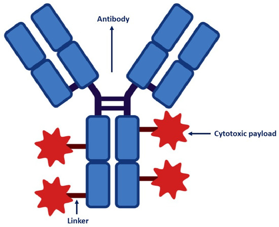 The components of ADCs are humanized mAbs that bind to a tumor-specific or associated antigen and a cytotoxic drug (payload) with anti-tumor activity conjugated through a molecular cleavable or non-cleavable linker [11]. Figure 1 illustrates the structure of an ADC.