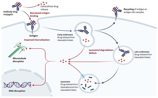 After binding to the target molecule and internalization via receptor-mediated endocytosis, ADCs reach lysosomes, where chemical or enzymatic cleavage induce the release of the cytotoxic agents. However, several causes might lead to impaired function.