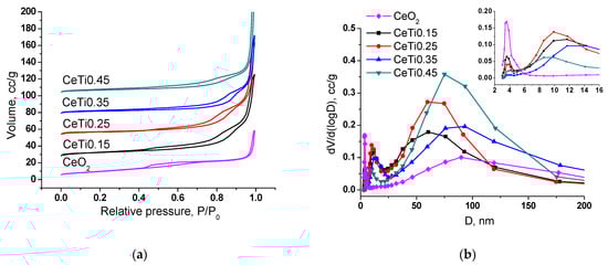 Nitrogen adsorption–desorption isotherms on mixed Ce–Ti oxides are characteristic for materials with a mesoporous structure (IV type) (Figure 1a). The capillary condensation hysteresis loop is assigned to the condensation of adsorbate in mesopores [42]. The pore volume increases with Ti introduction almost 2 fold from 0.085 for CeO2 to 0.157 cm3/g for CeTi0.15, but no further correlation with titanium content is observed in the series of mixed oxides.
