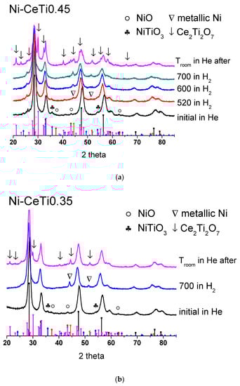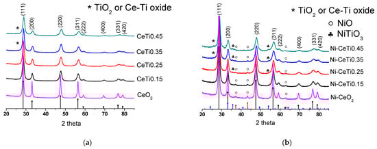 Supported nickel is presented as the NiO phase [PDF 00-044-1159] for catalysts with a low titanium content (Figure 2b). With increasing Ti content in the support, peaks of the NiTiO3 perovskite phase [PDF 04-010-7290] appear while the intensity of NiO peaks gradually decreases. For the Ni-CeTi0.45 catalyst with the highest Ti content, only reflections of the perovskite phase are observed. The cell parameter of the fluorite phase practically does not change after nickel deposition, which probably indicates that nickel is not incorporated into the support structure. However, as will be shown below, it can be connected to method limitations and Ni can be incorporated in minor quantities or into surface layers. The crystallite size slightly increased, possibly due to an additional calcination step after nickel deposition.