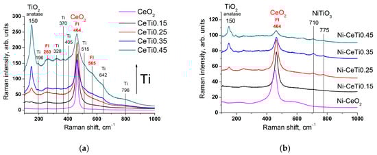 The structure of the samples was further investigated using Raman spectroscopy, which characterizes the vibrations of the oxygen lattice and is more sensitive to crystalline symmetry and the microstructure of materials. For all mixed oxides, a high-intensity band is observed in the region of 464 cm−1, which corresponds to the fundamental F2g symmetry mode of the cubic fluorite structure and is attributed to a symmetrical stretching mode of the Ce–O8 vibrational unit [45] (Figure 3a). After titanium introduction, the fluorite band broadens, which indicates the increased dispersion of its particles [46] and is in agreement with XRD data. Weak broad bands at 260 and 565 cm−1 can be assigned to the transverse acoustic (TA) mode and the non-degenerate longitudinal optical (LO) mode due to the presence of defects, which results from the formation of oxygen vacancies in the fluorite structure due to the substitution of Ce4+ by an ion with a different radius [47,48,49].