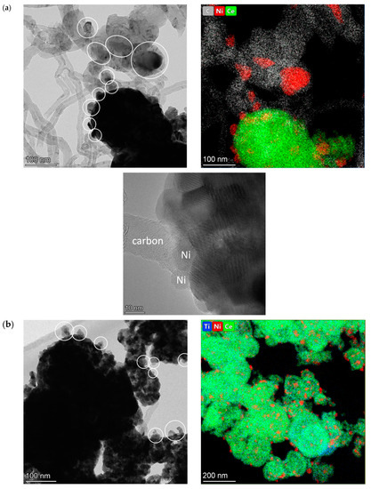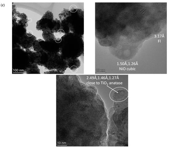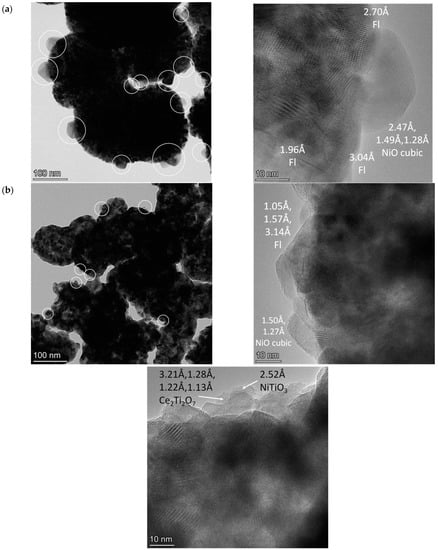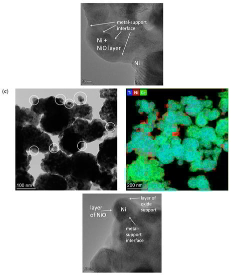 For catalysts based on pure ceria, NiO particles have an almost cubic shape, with particles sizes of 25–50 nm (Figure 4a). For Ti-containing catalysts, NiO particles have a more flattened shape, suggesting a stronger metal–support interaction and crystallite sizes of approximately 10–20 nm (Figure 4b,c).