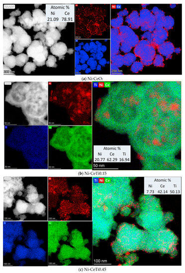 The dark-field images with EDX analysis of Ni-CeO2 demonstrated that nickel is distributed in the form of large particles over the surface of fluorite particle agglomerates (Figure 5a). For Ti-doped catalysts, the homogeneous distribution of Ti and Ce cations in the oxide structure is observed even at high Ti contents and Ni distribution is more uniform than for pure CeO2, suggesting that some Ni cations can be incorporated into the fluorite lattice.