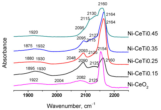 Adsorption bands at 2154–2164 cm−1 correspond to CO adsorption on support cations Ce4+ and Ti4+ [57,58,59,60,61]. For undoped Ni-CeO2, the adsorption band at 2154 cm−1 is symmetric and assigned to CO adsorption on Ce4+ cations. With Ti introduction, the band of CO complexes with Ti4+ cations appears at 2160–2164 cm−1, due to which the band at 2154 cm−1 is slightly shifted and becomes asymmetric. In addition, the shift towards higher frequencies can be due to the increase in the adsorption site strength of Ce4+ upon introduction of doping cations [39].