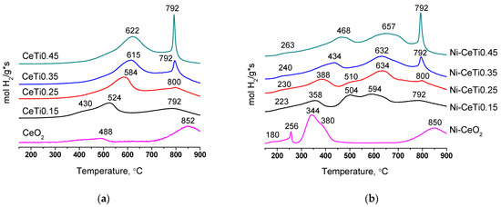 The deposition of nickel contributes to lowering the temperature of reduction beginning at 200 °C since the presence of NiO facilitates the reduction of active oxygen surface species [38,69]. Peaks at 220–260 °C can be attributed to the reduction of oxygen adsorbed on the surface. The introduction of nickel into the CeO2 structure leads to the formation of oxygen vacancies, which can absorb oxygen, being easily reduced at such low temperatures [38,69].