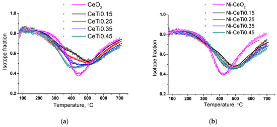 Experiments of the temperature-programmed isotope exchange (TPIE) of oxygen with C18O2 in a flow reactor were carried out to investigate the influence of Ti incorporation on oxygen transport characteristics. The experimental and simulated isotope fraction curves for supports and catalysts are presented in Figure 8. The diffusion activation energy for all samples is approximately 150 kJ/mol.