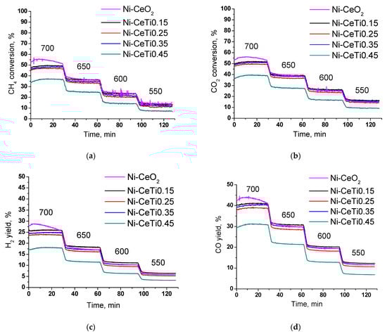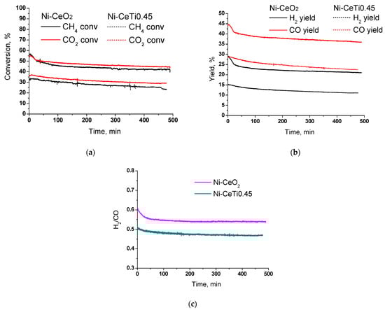 A series of 10%Ni/CeO2-TiO2 catalysts were investigated in dry reforming of methane in the work [36]. It was shown that catalysts containing Ti in the amount of 20 and 50 at.% provided higher activity than pure Ni/CeO2 and higher activity and stability than pure Ni/TiO2.