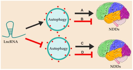 There has been accumulating evidence that lncRNAs are critical regulators of autophagy. LncRNAs generally function as competitive endogenous RNAs (ceRNAs) to regulate the expression of autophagy-related genes. In this review, we summarize recent advances in understanding the relationship between lncRNA and autophagy regulation in the context of neurodegenerative disorders. As autophagy is a double-edged sword, excessive or insufficient autophagy in neuronal cells can lead to homeostatic imbalance and neurodegeneration []. LncRNAs either promote or inhibit the progression of NDDs by activating or suppressing autophagic activity in neuronal cells under different circumstances (Figure 1). We also briefly outline some of the latest statuses of treatments and the potential challenges of lncRNA in therapeutic interventions.