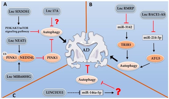 LncRNAs contribute to the pathogenesis of AD by modulating the autophagy pathway. Three different forms of functional cross-regulation between lncRNAs and autophagy are observed in AD: (A) LncRNA 17A, NEAT1, MIR600HG and SIX3OS1 accelerate the progression of AD by inhibiting autophagy. Both NEAT1 and MIR600HG bind to NEDD4L to promote the proteasomal degradation of PINK1 and inhibit mitophagy; SIX3OS1 inhibits autophagy by activating the PI3K/AKT/mTOR pathway. The distinct role of lnc-17A in autophagy inhibition is unknown. (B) LncRNA RMRP and BACE1-AS1 promote the development of AD through sponging miR-3142 or miR-214-3p to elevate the expression of TRIB3 or ATG5 to activate autophagy. (C) LINC01311 suppresses AD progression through sponging miR-146a-5p and inhibiting autophagy. The distinct function of miR-146-5p in neuronal cell autophagy is unknown.
