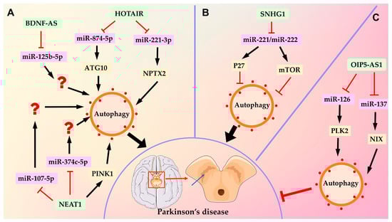 LncRNAs contribute to the pathogenesis of PD by modulating autophagy activity. Three different forms of functional cross-regulation between lncRNAs and autophagy are shown in PD: (A) LncRNA HOTAIR, BDNF-AS and NEAT1 promote PD progression by activating autophagy. NEAT1 can sponge miR-107-5p and miR-374c-5p or directly binds to PINK1 to activate autophagy. HOTAIR acts as a ceRNA to buffer the expression of miR-874-5p and miR-221-3p to upregulate ATG10- and NPTX2-mediated autophagy. BNDF-AS activates autophagy through miR-125b-5p. (B) LncRNA promotes PD pathogenesis by inhibiting autophagy. SNHG1 binds to miR-221/222 to upregulate P27 and mTOR expression, thus inactivating autophagy. (C) LncRNA OIP5-AS1 suppresses PD progression by activating autophagy. OIP5-AS1 promotes the expression of PLK2- and NIX-mediated autophagy by sponging miR-126 and miR-137, respectively. “?” means the target gene of miRNAs has not been identified in the paper.