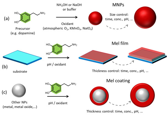 Scheme of the synthesis of (a) artificial melanin-like NPs (MNPs); (b) melanin-like films; (c) melanin-coated NPs.