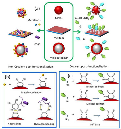 (a) Methods of covalent and non-covalent post-functionalization of melanin-like NPs, melanin-like films, and melanin-coated NPs. (b) Examples of non-covalent interactions. (c) Example of reactions for covalent functionalization.