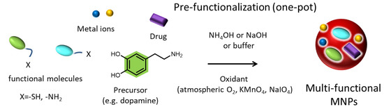 Going towards other interesting pre-modification examples that lead to MNPs with new surface properties, Chen and co-workers presented PDA NPs with increased hydrophilicity synthetized by the one-pot copolymerization of DA with the alkaline natural amino acid arginine [75]. On the contrary, a copolymer between DA and polyaniline (PANI) blended with poly(vinyl alcohol), used for the construction of nanofibers, was able to reduce the hydrophilicity and increase the electrical conductivity of the nanofibers [184]. The co-polymer of DA and PANI was formed in a solvent mixture of water/dimethylformamide (DMF) in the presence of p-toluene sulfonic acid and ammonium peroxydisulfate. Since the electrospinning-formed nanofibers, prepared in a second step, were used for peripheral nerve regeneration, it was proven that the incorporation of PDA-PANI increased the biocompatibility of the nanofiber, indicating that the copolymer can act as a building block of nanofibrous neural conduit. In a similar approach, the same co-polymer, PDA-PANI, was synthetized through the same one-step chemical oxidation protocol; however, additional functionality was added. In more detail, D,L-lactaide monomer was grafted into the PDA blocks of the PDA-PANI copolymer via ring-opening polymerization resulting in a terpolymer. A nanofibrous scaffold created from the terpolymer exhibited promising physicochemical and mechanical properties for tissue engineering combined with high biocompatibility [185].