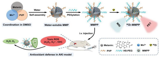 Schematic illustration of Mn-chelated MNPs illustrating their activity as a naturally antioxidative platform for PET/MR bimodal imaging-guided acute kidney injury therapy [128].