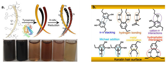 Schematic illustration of (a) synthetic procedure for the typical Ag NPs deposition of tyrosinase-colored hair, and (b) the possible mechanism of melanin-like pigment deposition to keratin hair surfaces [58].