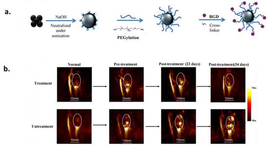 (a) Schematic illustration of the synthetic procedure of NaOH-generated MNPs that are PEGylated and loaded with RGD peptide, (b) PA images of treatment and un-treatment group after 3 h after intravenous injection of PEGylated MNPs functionalized with RGD (scale bar is 10 mm) [111].