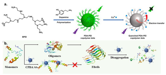Schematic illustration (a) of the synthesis of PDA-PEI copolymer dots and the Cu2+ determination based on the PDA-PEI copolymer dots, (b) of the action of PDA-PEI in the modulation of Aβ Self-Assembly [173,174].