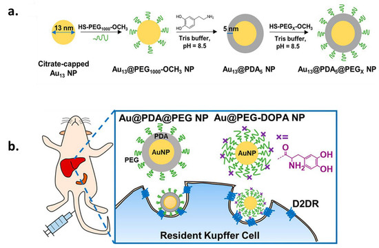 Schematic illustration (a) of the binding of PDA-coated Au NPs with dopamine receptor, (b) synthesis of Au NPs and coating with PDA [190].