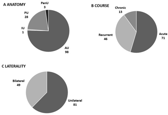 Patterns of noninfectious uveitis in the study cohort. Anatomic involvement (A), course (B), and laterality (C). NIU, noninfectious uveitis; AU, acute NIU; IU, intermediate NIU; PU, posterior NIU; PanU, panuveitis.