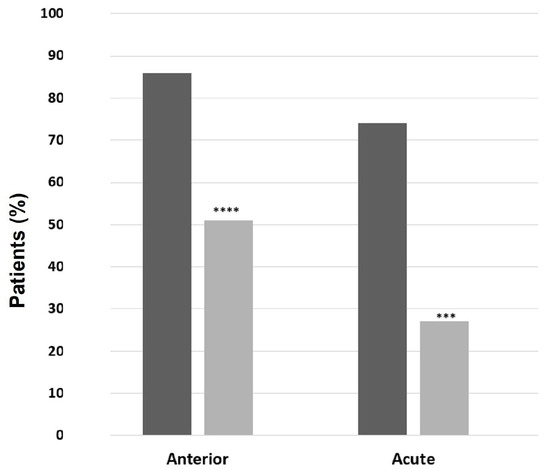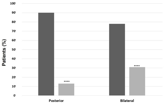 Patients with unilateral and bilateral noninfectious uveitis. In black, unilateral; in grey, bilateral. Categorical variables were presented with percentages and were compared using the Chi-squared test or Fisher’s exact test when appropriate. A p-value < 0.05 was considered significant (*** p < 0.001; **** p < 0.0001).