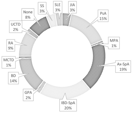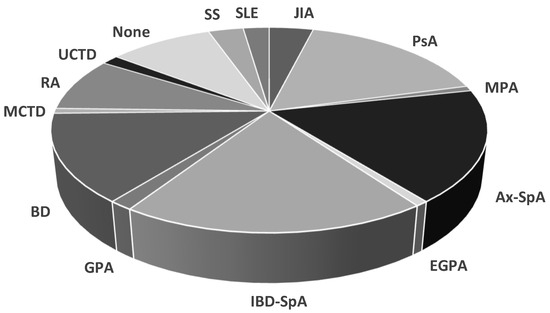 Rheumatologic diagnoses in the study cohort. Inflammatory-bowel-disease (IBD)-associated spondyloarthritis (SpA), axial spondyloarthritis (ax-SpA), psoriatic arthritis (PsA), Behçet disease (BD), rheumatoid arthritis (RA), juvenile idiopathic arthritis (JIA), Sjögren syndrome (SS), systemic lupus eritematosus (SLE), undifferentiated connective-tissue disease (UCTD), mixed connective-tissue disease (MCTD), granulomatosis with polyangiitis (GPA), eosinophilic granulomatosis with polyangiitis (EGPA), microscopic polyangiitis (MPA).