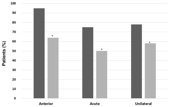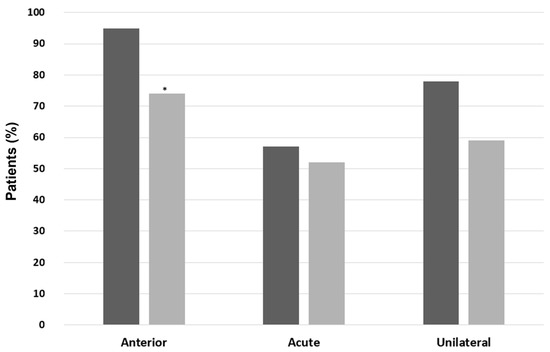 Patterns of noninfectious uveitis in patients with and without axial spondyloarthritis (ax-SpA). In black, patients with ax-SpA; in grey, patients without ax-SpA. Categorical variables were presented with percentages and were compared using the Chi-squared test or Fisher’s exact test when appropriate. A p-value < 0.05 was considered significant (* p < 0.05).