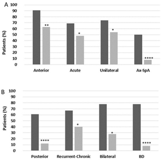 Patterns of noninfectious uveitis in accordance with human-leukocyte-antigen (HLA) distribution. (A) HLA-B27-positive (black) vs. HLA-B27-negative (grey) patients. (B) HLA-B51-positive (black) vs. HLA-B51-negative (grey) patients. Ax-SpA, axial spondyloarthritis; BD, Beçhet disease. Categorical variables were presented with percentages and were compared using the Chi-squared test or Fisher’s exact test when appropriate. A p-value < 0.05 was considered significant (* p < 0.05; ** p < 0.01; **** p < 0.0001).