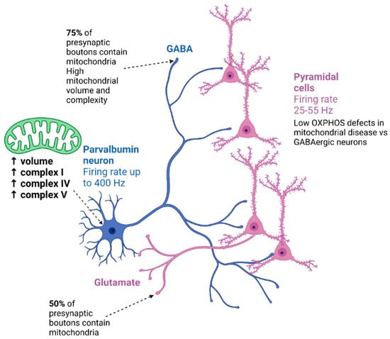 A study by Inan and colleagues explored the consequences of complex IV downregulation specifically within PV+ neurons using a cKO of Cox10 in mice [92]. Importantly, Inan et al. demonstrated that in control animals Cox1, the catalytic subunit of complex IV is differentially expressed in interneurons of the somatosensory cortex [92]. PV+ interneurons exhibited the highest Cox1 expression levels, measured by the percentage area stained within individual interneurons compared with somatostatin-expressing (SST+) and CR+ interneurons [92]. These findings further implicate higher metabolic demand of PV+ interneurons compared with other inhibitory subclasses. The mice with a Cox10 cKO in PV+ neurons demonstrated a schizophrenic-like phenotype with reduced sociability, impaired pre-pulse inhibition, and aberrantly high power of gamma-frequency oscillations in the cortex and hippocampus in vivo [92]. These features are hypothesised to be due to neuronal hyperexcitability, as interneurons have demonstrated a significantly higher rate of spontaneous action potential firing ex vivo [92]. However surprisingly, progressive loss of Cox1 in PV+ cells did not cause neurodegeneration in the affected animals; hence, the symptoms mice exhibited were considered to be due to the functional abnormalities of PV+ interneurons, rather than their attrition [92]. Since PV+ interneurons provide fast inhibition to pyramidal cells in the cortex, their dysfunction has been implicated in many animal models of epilepsy [93]. Despite this, the study did not show evidence of the mice experiencing seizures or movement disorders.